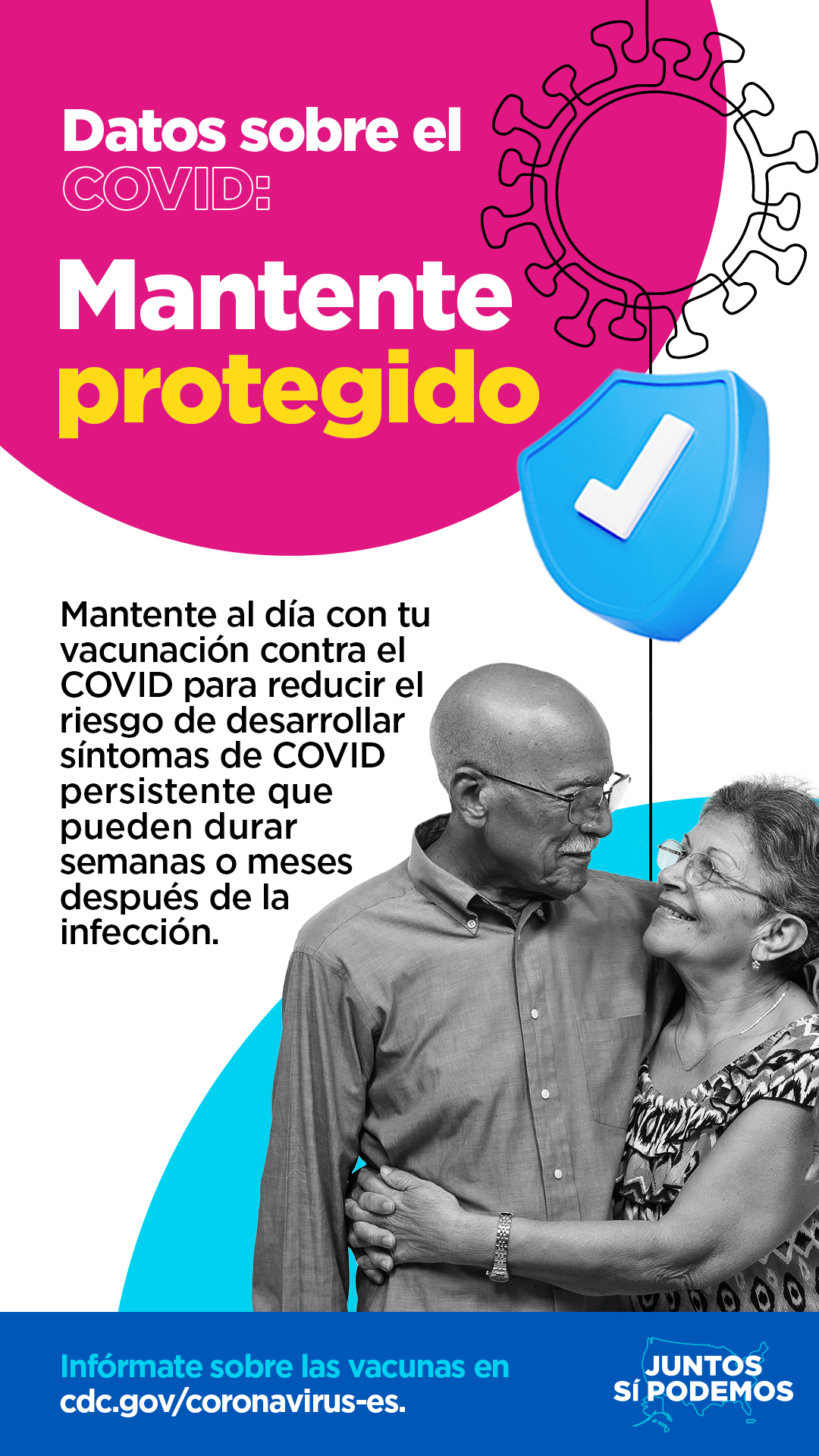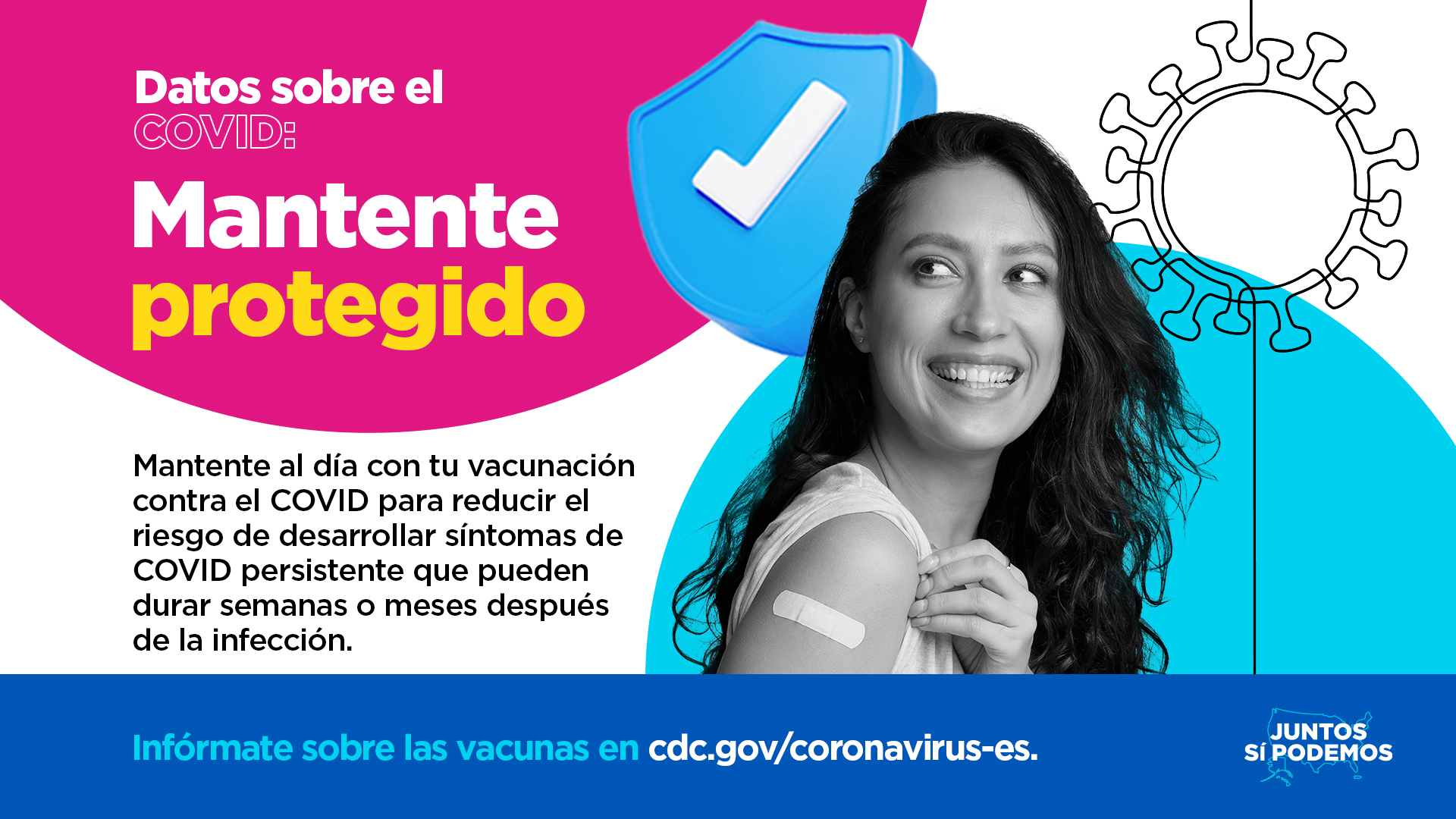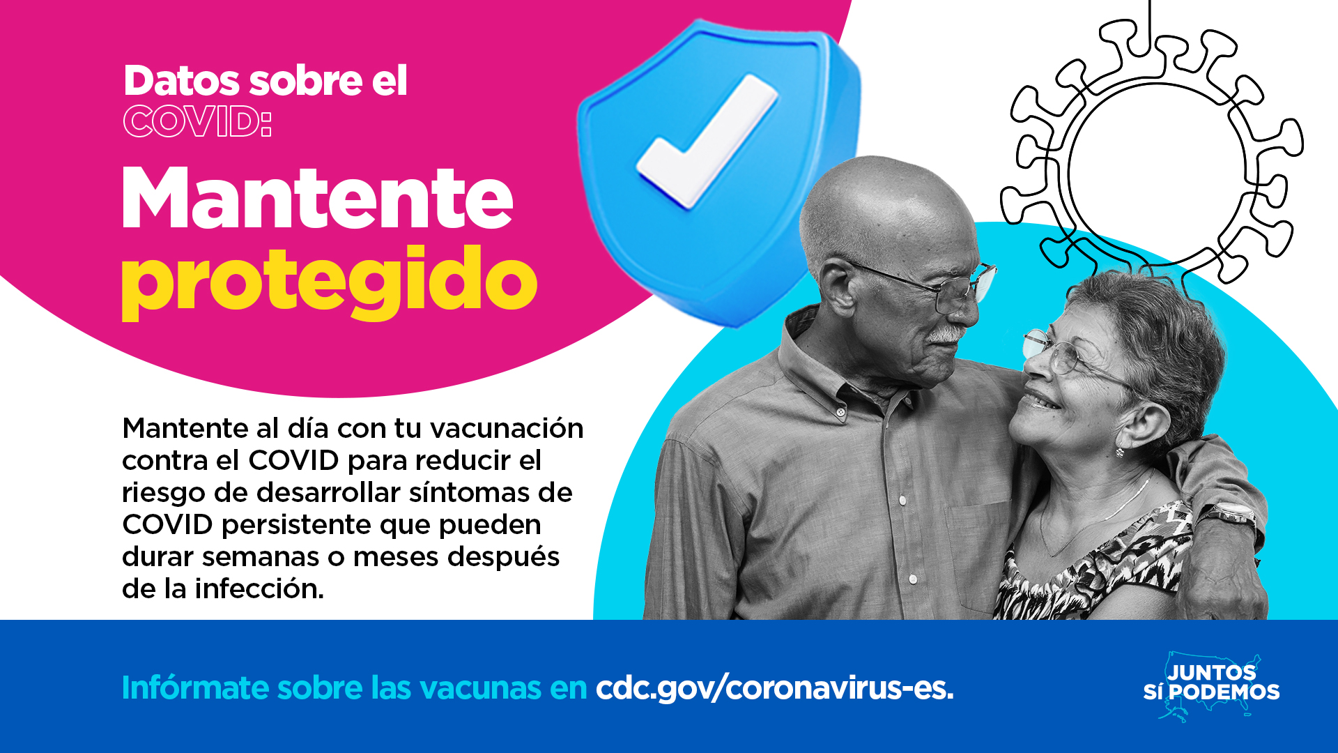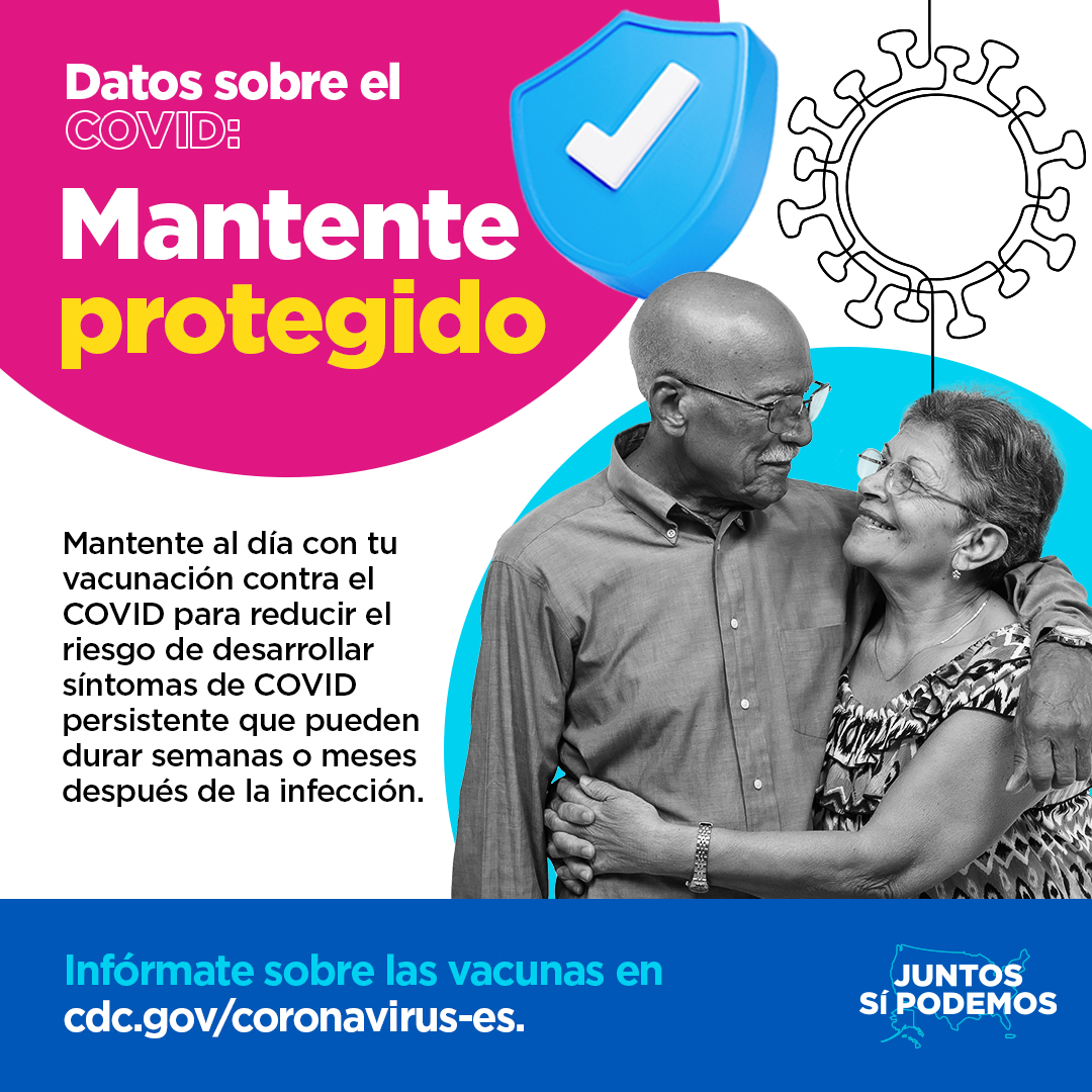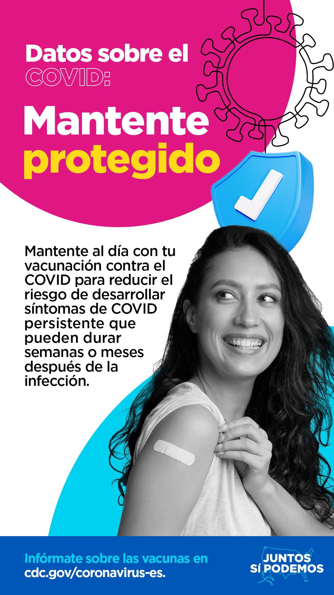 Mantente al día con tu vacunación contra el COVID para reducir el riesgo de desarrollar síntomas de COVID persistente que pueden durar semanas o meses después de la infección.